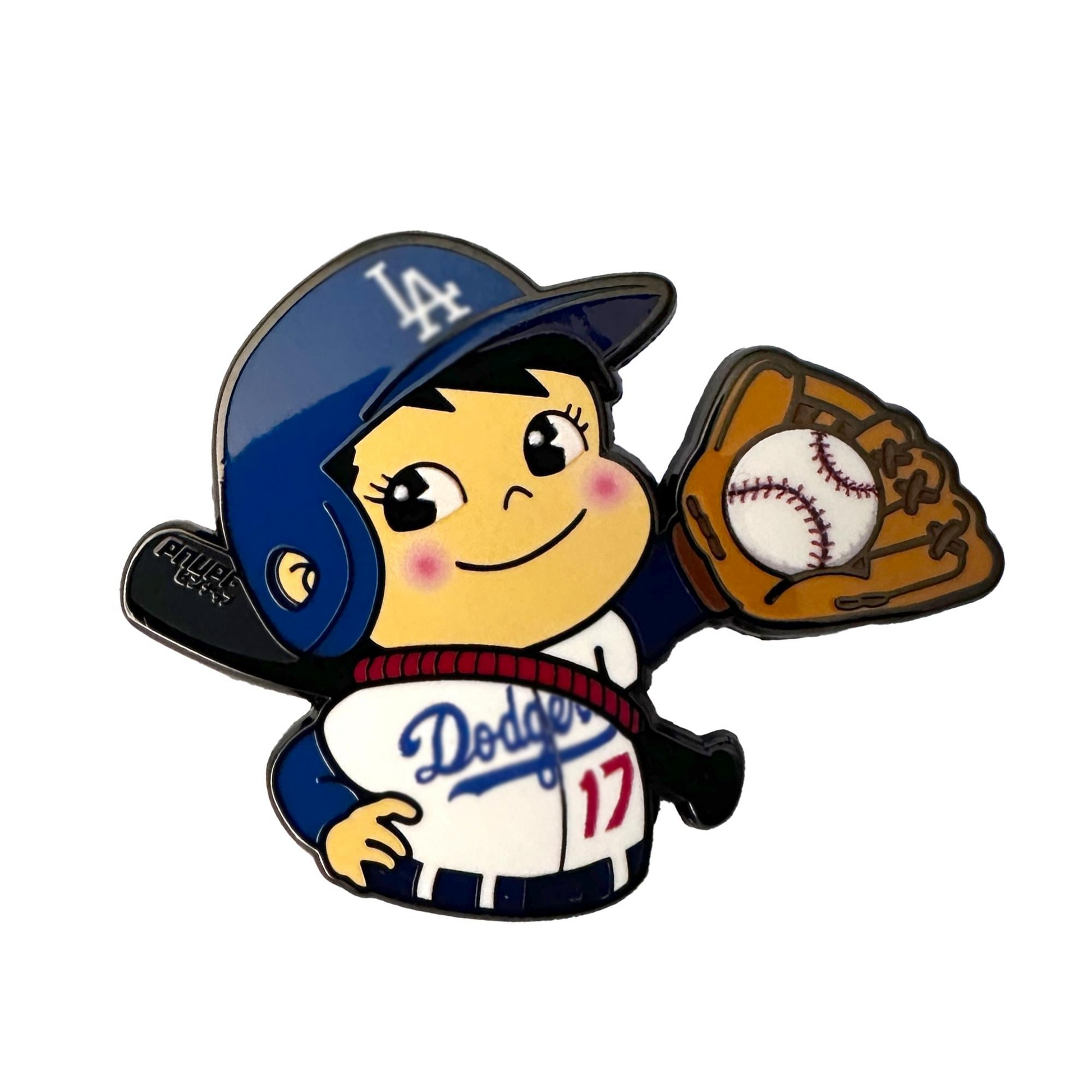 This hard enamel pin features Peko-chan dressed in an LA Dodgers uniform (#17), complete with a baseball glove and helmet — a playful tribute to Japan’s beloved candy mascot and one of baseball’s greatest players.